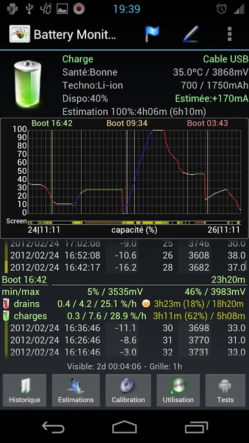 : Complete battery monitoring icon, history, graphicscomplete tool : Shows historical data (%, mA, mW, mV ), calculates estimated run-times aging, helps calibrate battery run-time.